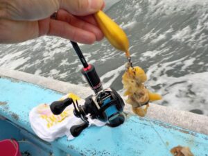 湾フグと違うのはオモリの重さですね。湾フグは10号前後のオモリに対し大原では25号・30号のオモリになるので重いです。